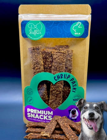 ChrupPaski z królika od BaffiDi to lekkostrawne i hipoalergiczne źródło pełnowartościowego białka, witamin i minerałów, które wspierają zdrowie oraz kondycję Twojego psa. Bogate w witaminę A, kwasy tłuszczowe omega-3 i omega-6, oraz cenne minerały, takie jak żelazo i cynk, wzmacnia odporność, dba o zdrową skórę i lśniącą sierść oraz wspomaga pracę układu nerwowego. Dzięki niskiej zawartości tłuszczu i cholesterolu smaczki z królika są idealnym wyborem dla psów z nadwagą i alergiami pokarmowymi. Podaruj swojemu pupilowi wyjątkowy smak i zdrowie z ChrupPaskami z królika od BaffiDi – naturalnymi i pełnowartościowymi przysmakami!